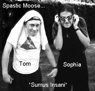 6.(SR8) Doesn't Have A Name Yet. Our 5th album, called VECTOBOT was finished last summer and is due out for release on CD soon. Again I must claim that we are improving our ability to make songs. Prospective hits include "Sultry Pantry", "Down In The Pasement", "How To Make A Dry Day Moist", and "The Song Where Tom Was Trying To Jam But Sophia Was Trying To Play Beck Songs And Taleen Didn't Know What The Hell Was Going On But Then Tom Got Them All Together And It Rocked Except Tom Didn't Have The Trumpet Track Turned Up Very Loud So It Was Hard For Sophia To Mix But Really It Was Sophia's Fault Because She Should Have Been Doing That Stuff Since She Is The Official Producer And Sound Engineer And Then She Got The Pizza". We may eventually change the name of that third song to "Snow Swan". This is a shorter album -- Sophia told me that was cool because Guided By Voices does it, and, hitting my weak spot, I let her convince me to do it. AVAILABLE ON CD